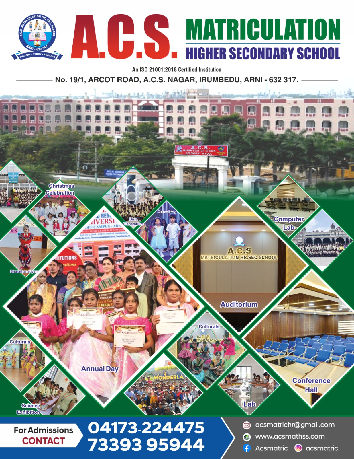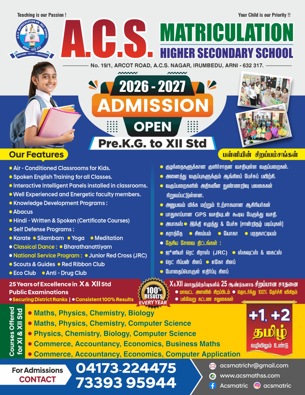A.C.S. Matriculation Higher Secondary School, Arni an institution of academic excellence, was established in the academic year 1999 – 2000 with a cherished desire to serve the cause of humanity through education. This institution has been reorganized by the directorate of school Education Chennai. It is a Matriculation Higher Secondary School for both boys and girls from LKG Std. to XII Std.